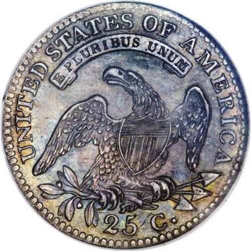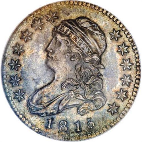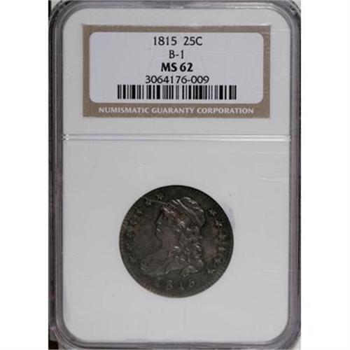 <B>1815 25C MS62 NGC.</B></I> B-1, R.1. The lone variety for the year. This attractively toned piece shows soft, pleasing luster and no trace of wear. Violet and olive-gold patina drapes the faintly marked surfaces, and the reverse shows occasional blue accents. A few short, parallel abrasions are present on Liberty's cheek, though the overall eye appeal remains strong. Census: 7 in 62, 39 finer (11/07).<BR><BR><B>Coin Engraver:</B> John Reich<BR><BR><b>Shipping:</b> Coins & Currency (<a target="_blank" href="http://www.heritageauctions.com/common/shipping.php">view shipping information</a>)