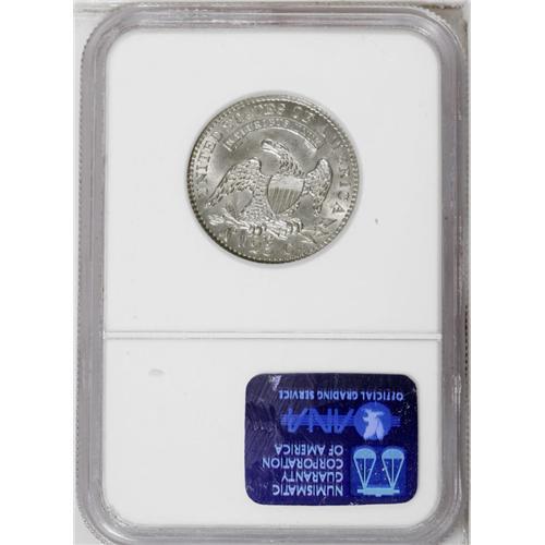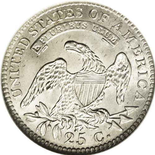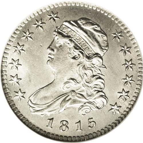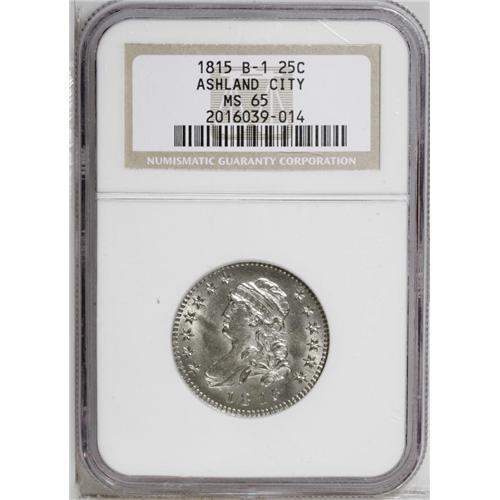 <B>1815<25C> MS65 NGC.</B></I> Ex: Ashland City Collection. B-1, the only known dies, R.1. Die State I. This is the premier issue in the Capped Bust quarter series. While it is popular for first-year type purposes, the 1815 is probably more desirable as a low mintage, conditionally challenging date. A mere 89,235 pieces were produced from a single obverse and reverse die marriage. While circulated and lower Mint State survivors are available with more or less frequency, Gems are undeniably rare with just nine MS65 examples known to NGC and PCGS (7/06). The present example is an early die state with no clashmarks and reverse repunching on the base of the second T in STATES. The A in STATES is also repunched. This is an uncommonly well struck representative of the design with fully denticulated borders and crisp definition over virtually all features. Both sides present as untoned with a lustrous, frosty-white sheen. There is not a single noteworthy abrasion, but a tiny planchet void in the obverse field before Liberty's nose is a worthwhile pedigree marker. Census: 7 in 65, 5 finer (7/06).