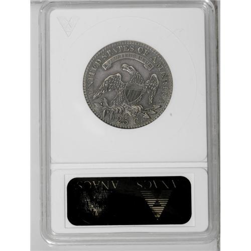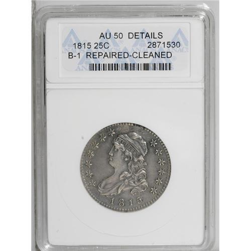 <B>1815<25C>--Repaired, Cleaned--ANACS. AU50 Details.</B></I> B-1, R.1. Crudely repaired at 12 o'clock on the obverse. The reverse appears unaffected. This sharp piece is bright from a cleaning, but has mostly retoned lavender-gray.
