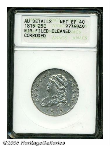 <B>1815<25C>--Rim Filed, Cleaned, Corroded--ANACS. AU Details, Net XF40.</B></I> B-1, R.1. Light pewter surfaces with minor roughness as expected, given the description. This is the first year of issue for the Capped Bust design, an important bidding consideration.