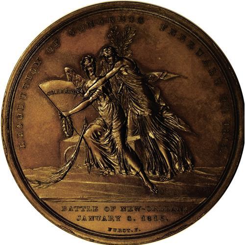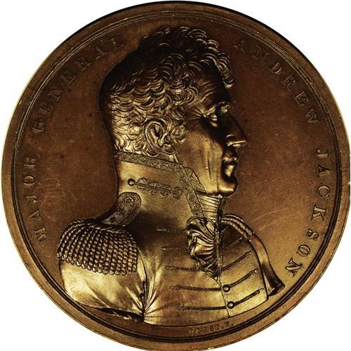 <B>1815 Andrew Jackson Battle of New Orleans Medal MS63 Uncertified.</B></I> Bronzed copper. 65mm. Julian MI-15. 65mm. Dies by Moritz Furst. A well struck and handsomely designed medal that commemorated Jackson's success in the famous battle, which allowed a positive American conclusion to the War of 1812. Brick-red and light mahogany toning. A few old, faint hairlines are detected beneath a lens.<BR><I>From The Troy Wiseman Collection.</B></I>