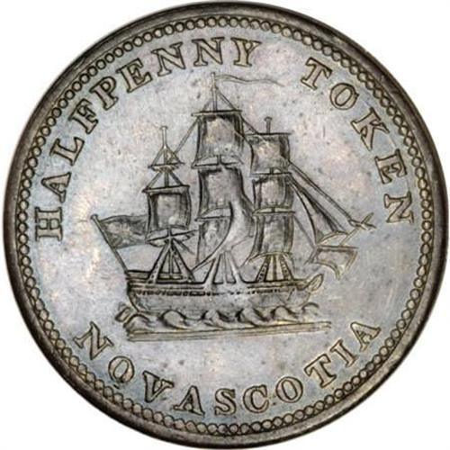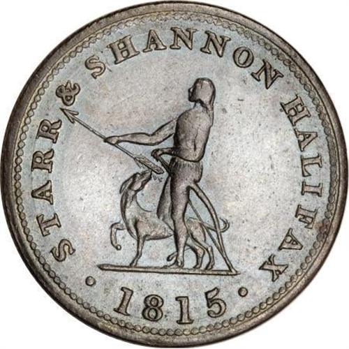 <B>1815 Breton-884, NS-11A1, Thin Flan Halfpenny Token.</B></I> Breton-884, NS-11A1. Copper, 27 mm, engrailed edge. Starr and Shannon halfpenny. They were hardware merchants who issued halfpennies in colonial Nova Scotia. The tokens were produced by John Sheriff of Liverpool. This is a choice example with just a hint of original mint red around the letters. The current Charlton catalog value is $500. <BR><BR><b>Shipping:</b> Coins & Currency (<a target="_blank" href="http://www.heritageauctions.com/common/shipping.php">view shipping information</a>)