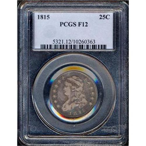 <b>1815 Capped Bust Quarter Dollar. PCGS graded F12.</b> Smooth surfaces, balanced even wear, and nice color. Only 89,325 minted <b>(PCGS # 5321)</b> <i>