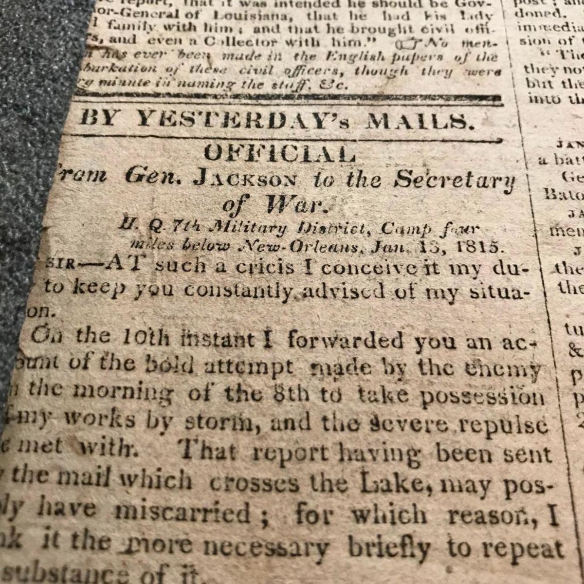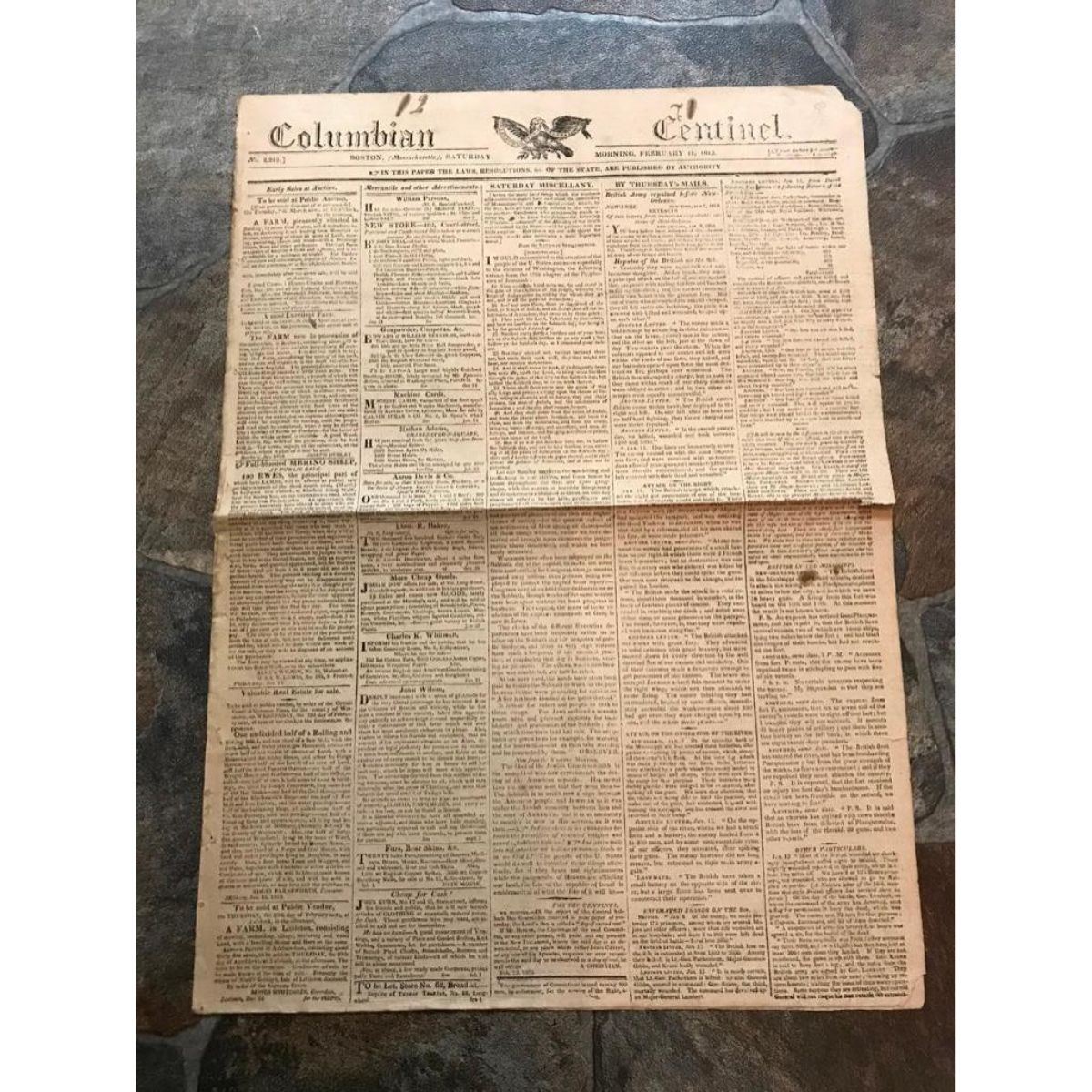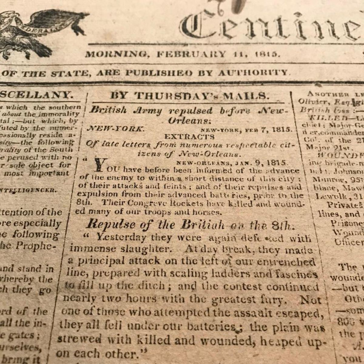 Original 1815 newspaper, published only a few days before the end of the War of 1812. Article titled "British Army repulsed before New Orleans." British loss & casualty report, news of General Andrew Jackson & the latest from New Orleans, along with auctions, classifieds  ( Merino Sheep for sale, furs & bear skins & ox hides, wine & brandy ) & personal notices. ( tavern's to be leased & pleasant country houses for sale ). Fantastic read for a 200+ year old publication. 4 pages. 14" X 19 1/2". * numbers handwritten in 200 yr old ink on front cover, top.Â