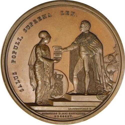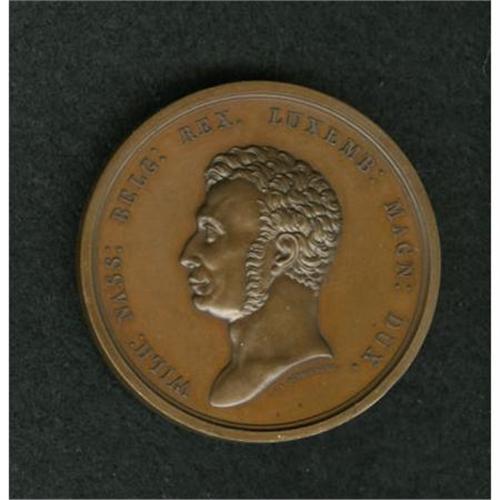 <B>1815 Netherlands Commemorative Medal.</B></I> Bronze. 55 mm, 91.6 gm. Commemorates the establishment of the kingdom of Holland in 1815. The medal was expertly engraved by I.P. Schouberg and features on the obverse a bust of William I. The reverse has William standing near his throne, receiving a woman handing him documents.<BR><BR><b>Shipping:</b> Coins & Currency (<a target="_blank" href="http://www.heritageauctions.com/common/shipping.php">view shipping information</a>)