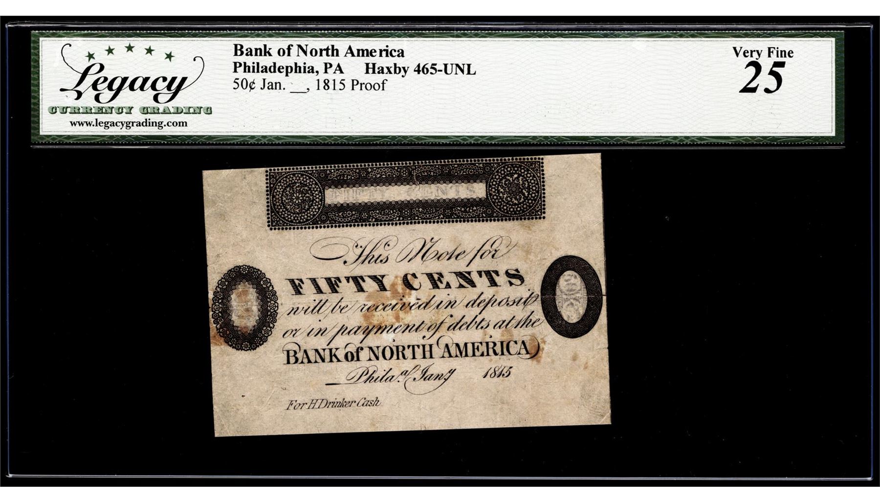 One 1815 Proof Fifty Cents Bank of North America Philadelphia, PA Obsolete Note Legacy VF25. Legacy Graded.