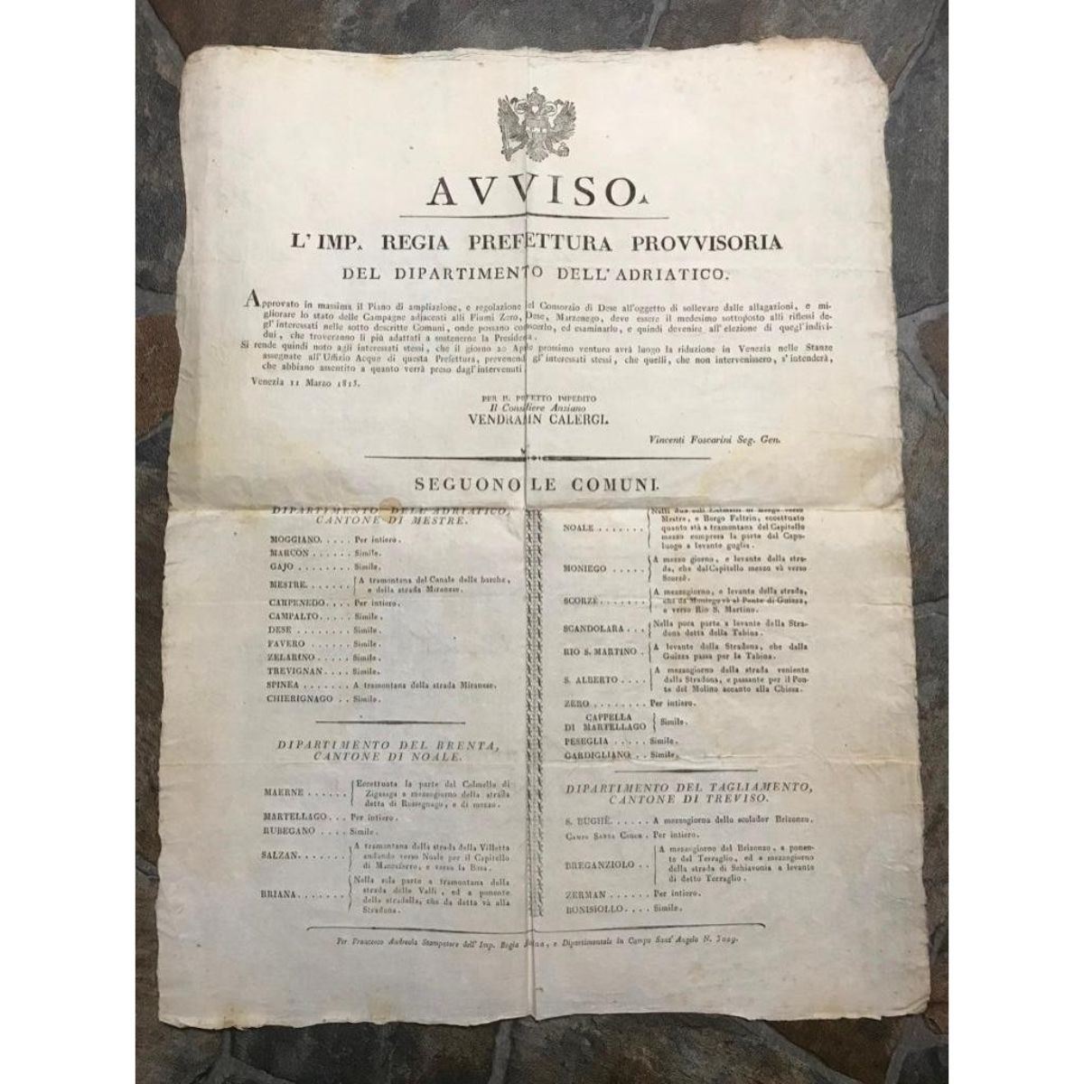 Large early 19th-century Italian hand-made paper document -Avviso,L'Imp, Regia PrefetturaProvvisoriaDel Departmento Dell' Adriatico... dated March 11, 1815, Venice Italy. 17 1/2" X 24".