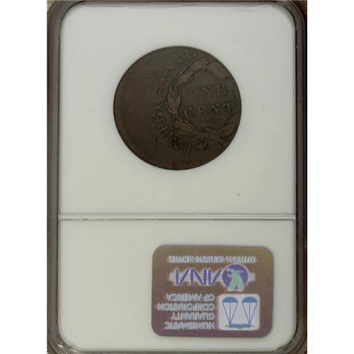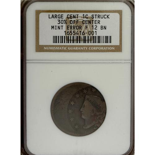 <B>(1816-1835) Matron Head Large Cent--Struck 30% Off Center--Fine 12 NGC.</B></I> Widely off center toward 4 o'clock. The 1 and the top half of the 8 are present, but the last two digits of the date are off the flan. The upper half of the obverse is moderately granular. EAC 10.<BR><BR><b>Shipping:</b> Coins & Currency (<a target="_blank" href="http://www.heritageauctions.com/common/shipping.php">view shipping information</a>)