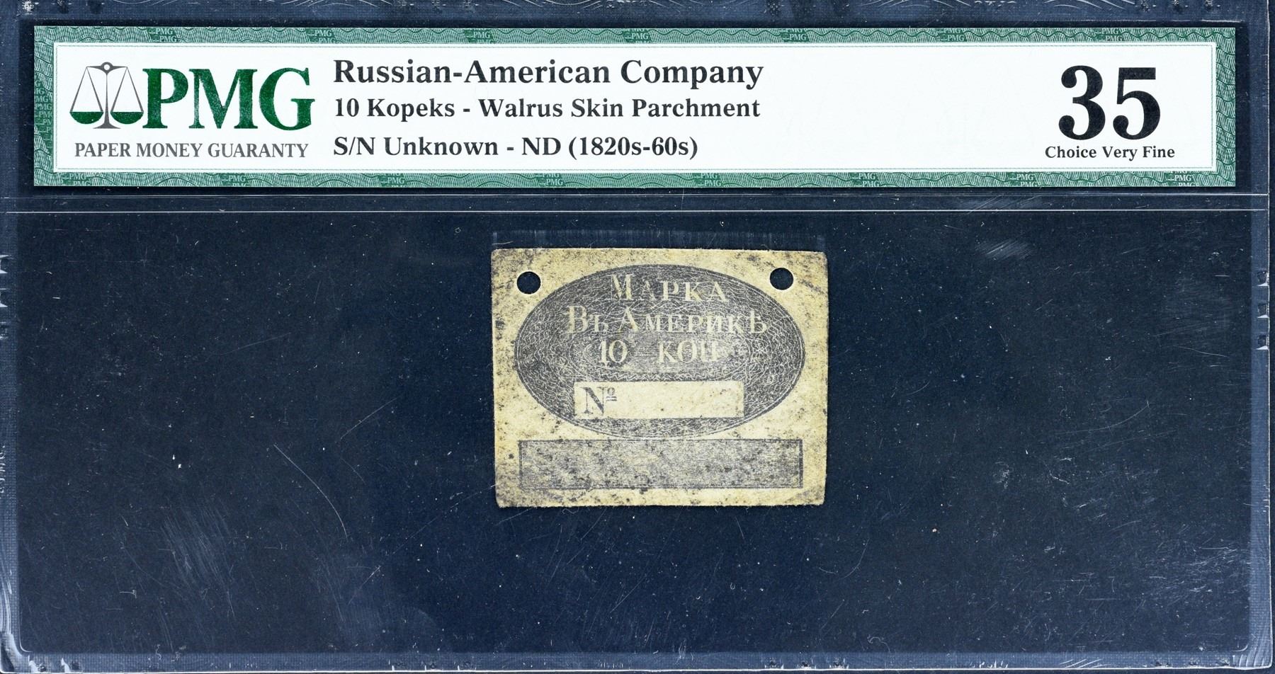 Description: Printed in black with two corners pierced as issued. Even handling throughout but remarkably only one corner fold and no tears. Printing is quite bold for the assigned grade. Face has a finely engraved oval protector with spiral details with the Russian legend translated NOTE IN AMERICA with the denomination “10 KOP” below. Back displaying the company seal using a double headed Imperial Russian eagle within an oval frame, legend in Russian translated UNDER THE HIGH PATRONAGE OF HIS IMPERIAL MAJESTY.