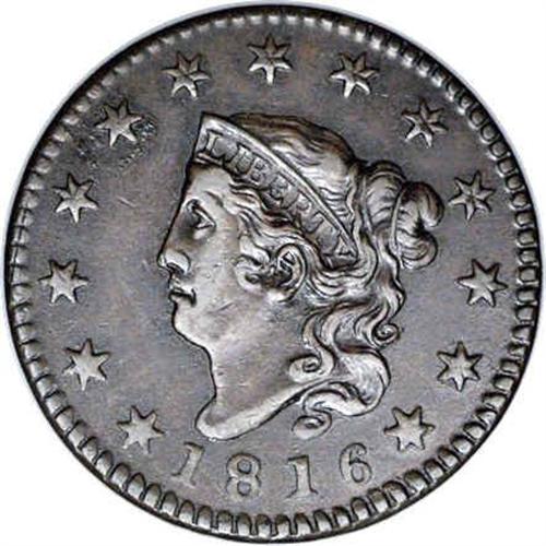 <B>1816<1C> N-9, Low R.3. AU50 NGC. XF40 EAC.</B></I> While repunching is seen on stars 7-12, the more obvious identifier for this variety is the double denticle over the E in UNITED. This early die state shows almost none of the flowlines seen around the peripheries of later states. Well struck, the surfaces are deep brown overall with slightly lighter accents over the highpoints. Very lightly abraded with the only mentionable mark being a shallow staple scratch from Liberty's hair toward star 12.<BR><I>Ex: Del Bland, Jon Hanson (7/191969).</B></I> Envelope Included.