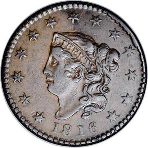 <B>1816<1C> N-3, R.4. AU55 NGC. VF35 EAC.</B></I> A third and final use of Obverse 1, the reverse is most easily attributed by the double denticle over the E in UNITED. Not a Randall Hoard variety and seldom seen in higher grades. This piece is a bit weakly struck and each side shows medium brown patina on the left half with deep, almost charcoal coloration on the right half.<BR><I>Ex: George Ramont (6/19/1970).</B></I> Envelope Included.