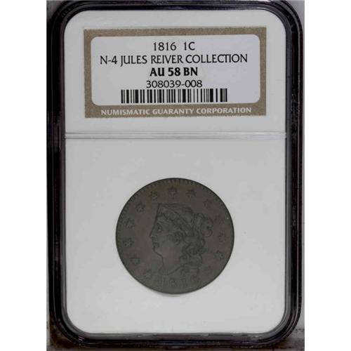<B>1816<1C> N-4, Low R.3. AU58 NGC. VF30 EAC.</B></I> The earliest die state of the four pieces in Jules' Collection, this piece shows Liberty's mouth closed and a couple of crisp lines below the first 1 in the date. A bit softly struck, the surfaces show a deep, rich brown patina with a few small abrasions present.<BR><I>Ex: George Ramont (8/9/1977).</B></I> Envelope Included.