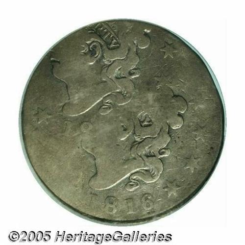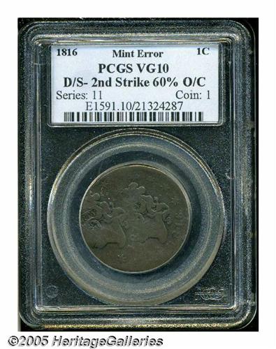 <B>1816<1C>--Double Struck, Second Strike 60% Off Center--VG10 PCGS.</B></I> N-4, High R.2. A dramatic example of this widely collected series and always popular as an error. Here the second striking is due north of the first, with the resultant blurring of details at the top of the first striking. Bright, light brown surfaces. Apparently this coin circulated for many years before its peculiarity caused it to be withdrawn from the channels of commerce.