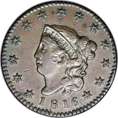 <B>1816<1C> N-8, R.1--Improperly Cleaned--NCS. AU Details. VF20 EAC.</B></I> This intermediate die state shows clear evidence of the rim break over stars 11-12. Generally well struck, the surfaces are brown with a significant presence of bright olive color on each side.<BR><I>Ex: George Ramont (4/1967).</B></I> Envelope Included.