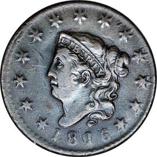 <B>1816<1C> N-9, Low R.3--Improperly Cleaned--NCS. XF Details. VF20 EAC.</B></I> This late die state shows heavy flow lines around the margins, the stars drawn toward the rim, and mushy overall definition--all an indication of overuse of this die pairing. Deep brown-blue coloration is seen over each side with surfaces that seem just a bit too bright to be natural. Envelope Included.