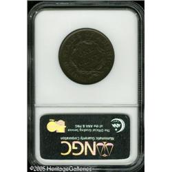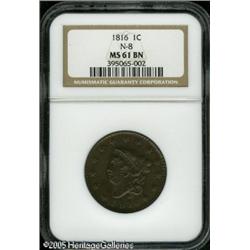 <B>1816 1C MS61 Brown NGC.</B></I> N-8, Low R.3. Noyes Die State C. Medium glossy brown color overall greets the viewer. There are no marks or spots of particular note, only a little strike bluntness at the peripheral areas of the obverse. As of (1/05), the finest of just two pieces certified by NGC as Newcomb-8. Lot:5134