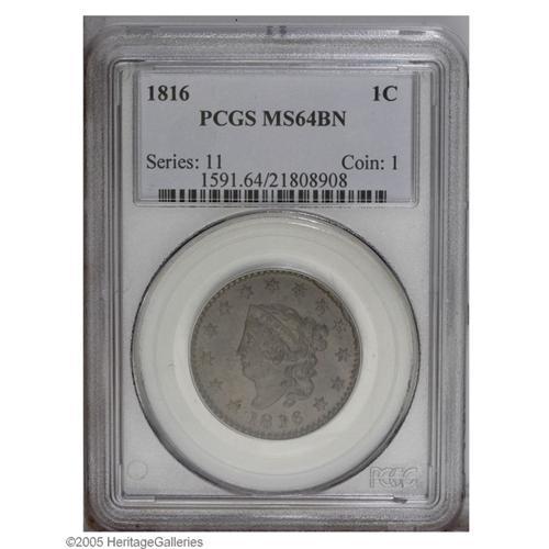 1816 1C MS64 Brown PCGS. N-2, R.1. The crumbling rim a 1816[1C] MS64 Brown PCGS.