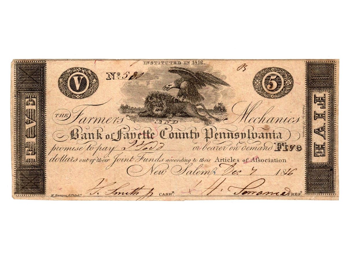 One 1816 $5 The Farmers and Mechanics Bank Pennsylvania Note.