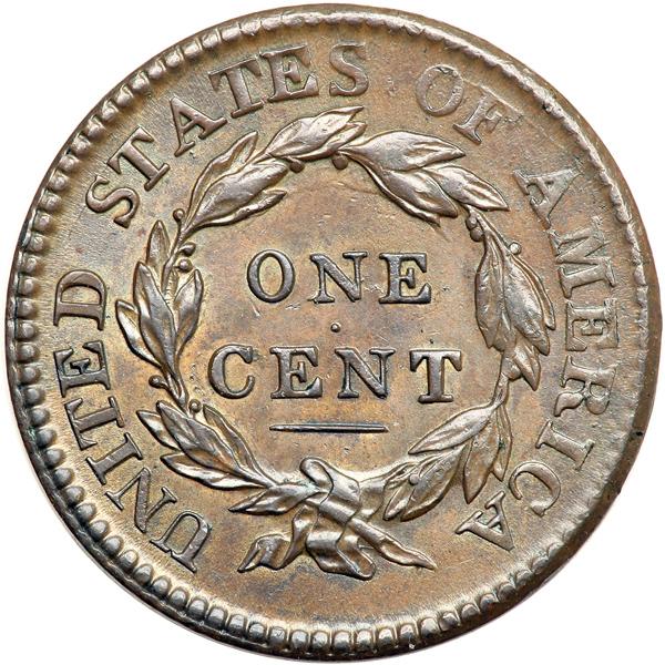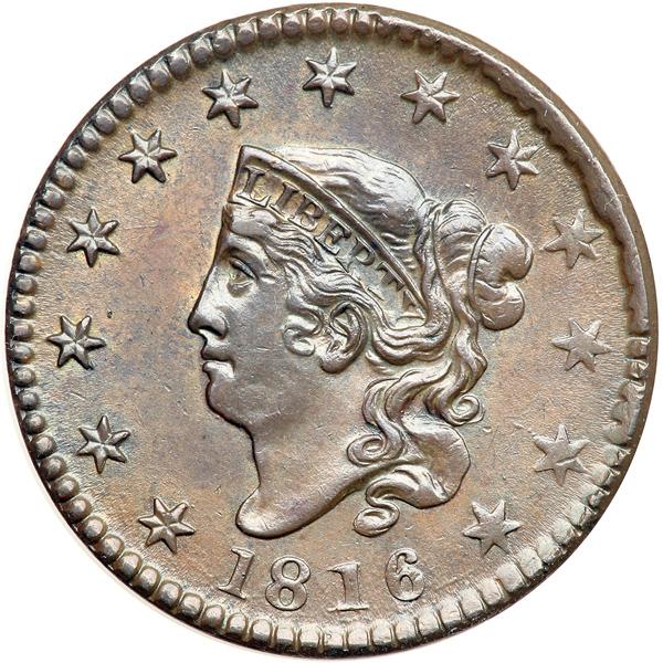 1816 Coronet Head Cent. PCGS graded MS-63 Brown. Glossy medium brown and chocolate with frosty lighter brown in protected areas. No spots or notable signs of contact. Great eye appeal for the grade. LDS with an additional rim cud break between stars 11 & 12, and the original rim cud at stars 8-11 extends to star 7.5. The die cracks at ST and OF are stronger, and the one at OF extends to the dentils over the adjacent A. The fields are flowlined and clear die clashmarks show inside the wreath. The browlock is rather well struck, but stars 10-13 are weak. The reverse is rotated 20 degrees CW. Most likely another attractive refugee from the Randall Hoard of mint state cents, but this die state is not typical of those from the hoard. Our grade is MS60. Pop 2; 1 in 64; A total of 3 graded at PCGS for the variety. DWH #0368 (PCGS # 36526) .