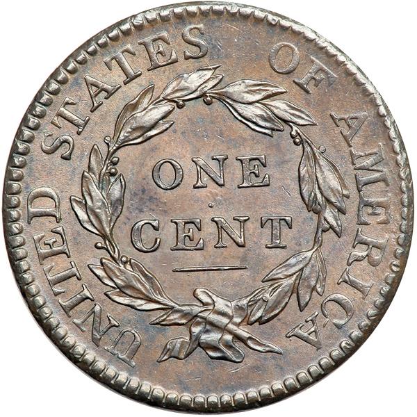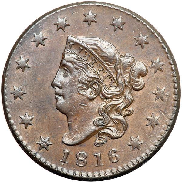 1816 Coronet Head Cent. PCGS graded MS-63 Brown. Choice lustrous medium brown and chocolate with frosty light brown toning in protected areas and tiny splashes of slightly darker steel brown toning sprinkled about the reverse. Just a hint of rub on the highest points of the design. Excellent eye appeal with only a few trivial marks, including a dull nick high on the neck and a couple light marks near the dentils between stars 11 & 12. EDS. The fields are smooth and satiny, the fine die lines over AME are visible, the repunching on the lower half of the D in UNITED is strong, and the dash between the C & A in AMERICA is bold. Plated in the Wright book to illustrate the variety. Called MS60 and tied for CC#5 in the Noyes census, his photo #28104. Our grade is AU58. Pop 1; 2 in 64; 1 in 66. Only 4 graded at PCGS for the variety. DWH #3113 (PCGS # 36532) .