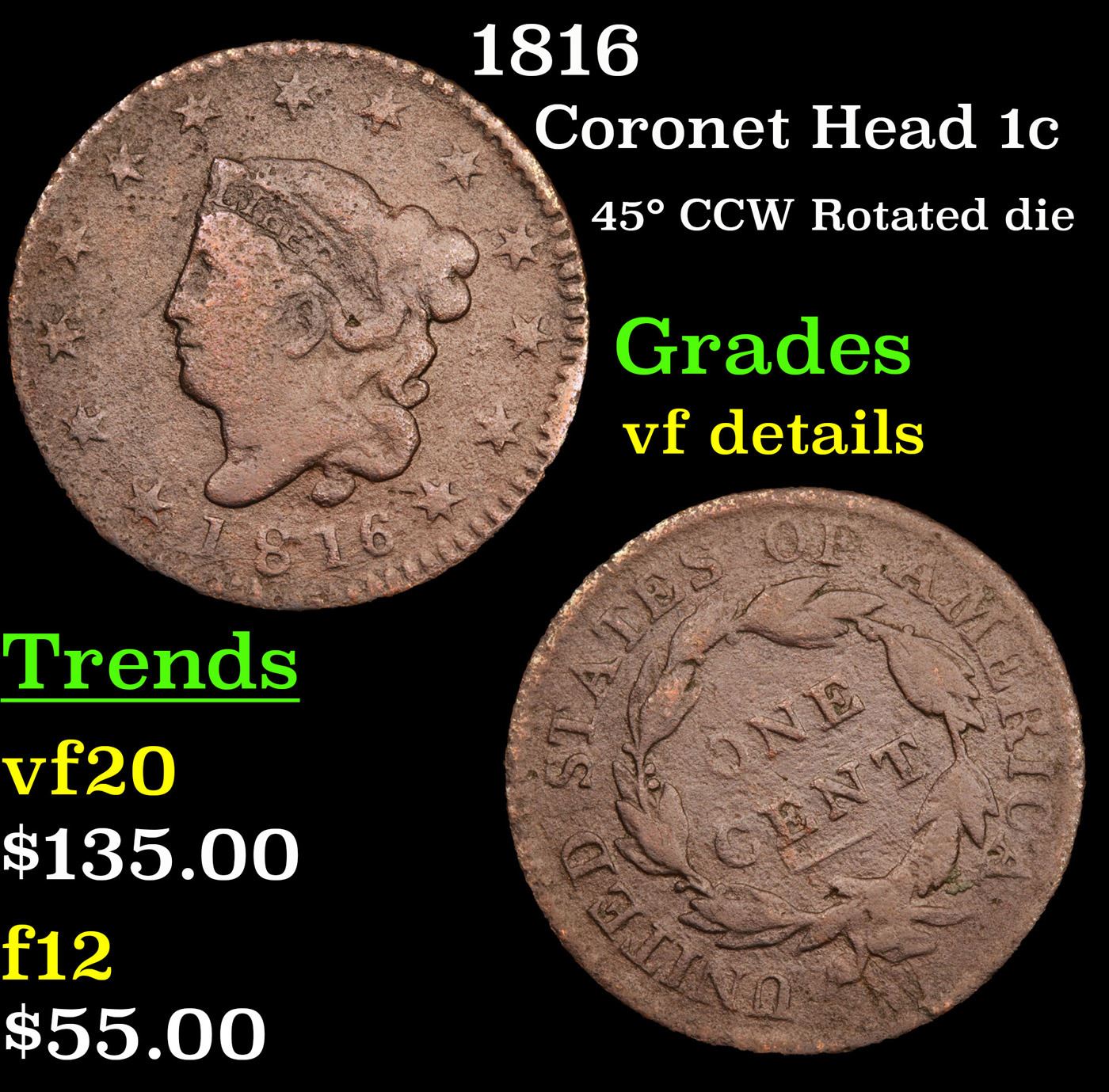 1816 Coronet Head Large Cent 1c Grades vf details.