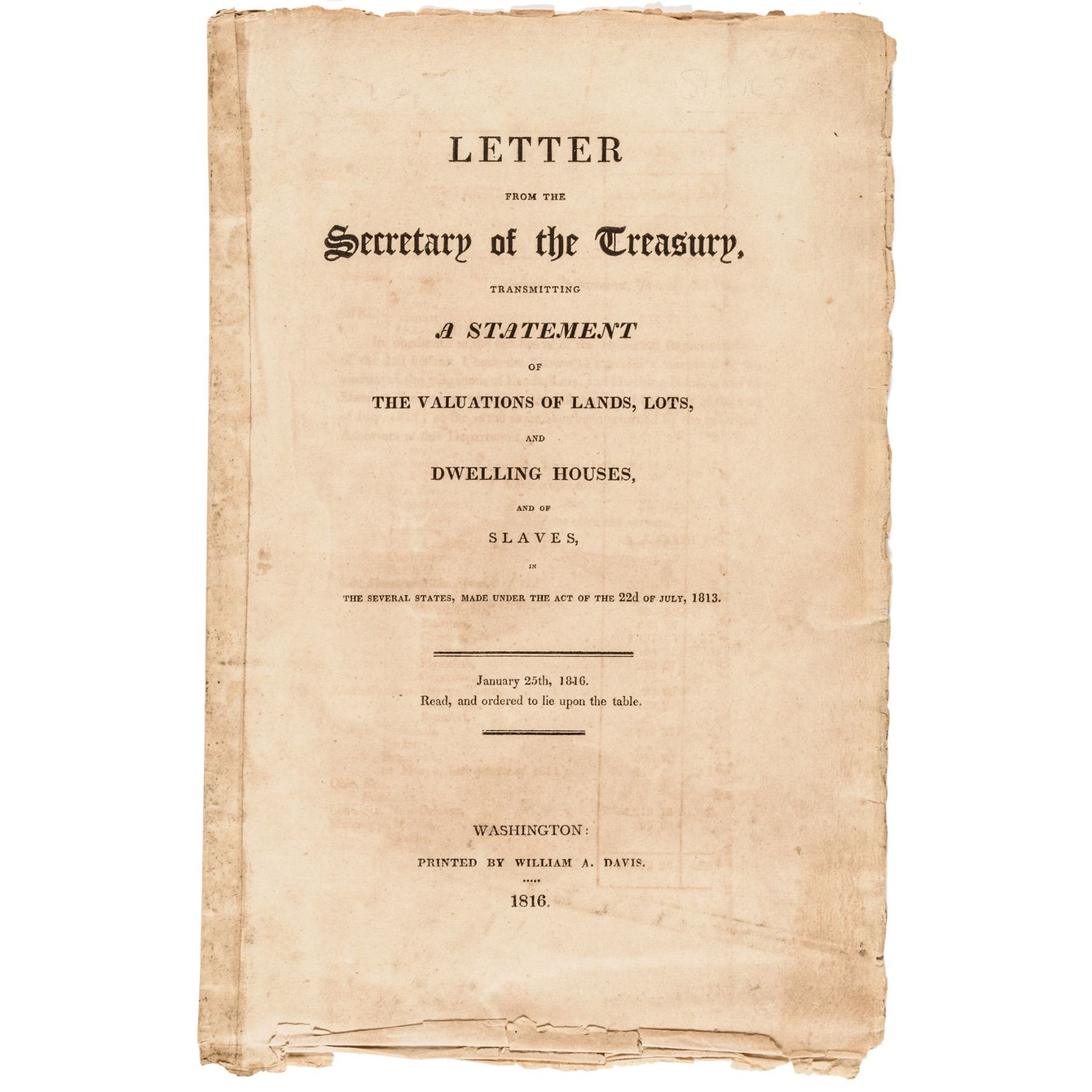 1816-Dated, First Edition Imprint, entitled, “LETTER FROM THE SECRETARY OF THE TREASURY, TRANSMITTING A STATEMENT OF THE VALUATION OF LANDS, LOTS, AND DWELLING HOUSES, AND OF SLAVES,” Washington, Printed by William A. Davis, Very Fine.