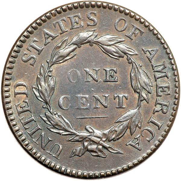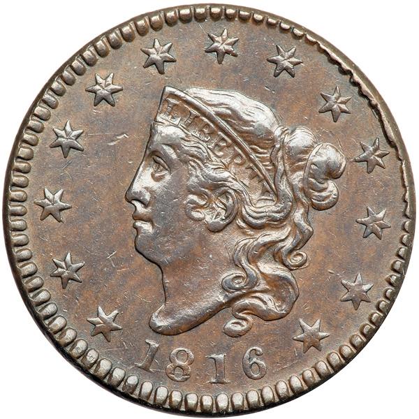 1816 N-1 R4+. EF-45. Glossy chocolate brown with traces of frosty light steel brown and tan toning in protected areas, the toning very delicately mottled in the left obverse field. Only a few trivial marks, including a very light nick in the field between star 4 and the forehead. MDS with crumbling in the dentils at stars 8-11 and a very faint die crack through the tops of TED. Excellent eye appeal. Called EF45 choice and tied for CC#4 in the Noyes census, his photo #20837. Bland says EF45, CC#4 among his confirmed examples. Removed from an NGC slab graded MS61BN (NGC label included). DWH #2572.