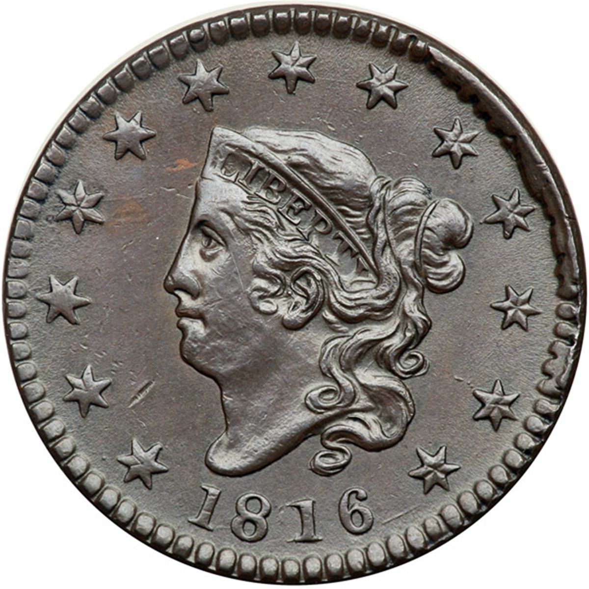 1816 N-2 R1 MS60+. Attractive glossy steel and chocolate brown with satiny mint luster covering the protected areas. The only marks are a diagonal nick-like pre-striking planchet mark in the field right of star 2 and a faint diagonal hairline scratch left of the curl on the cheek, plus a tiny splash of slightly lighter toning between star 5 and the coronet. The reverse is choice. M-LDS with the usual irregular rim cud break from star 8 to star 11 plus a small but clearly defined rim cud between stars 11 & 12. (In the latest state, the earlier rim cud extends CCW to between stars 7 & 8.) The reverse is rotated 30 degrees CW relative to a normal head-to-foot die orientation. Most likely from the famous Randall Hoard of mint state cents dated 1816-1820.