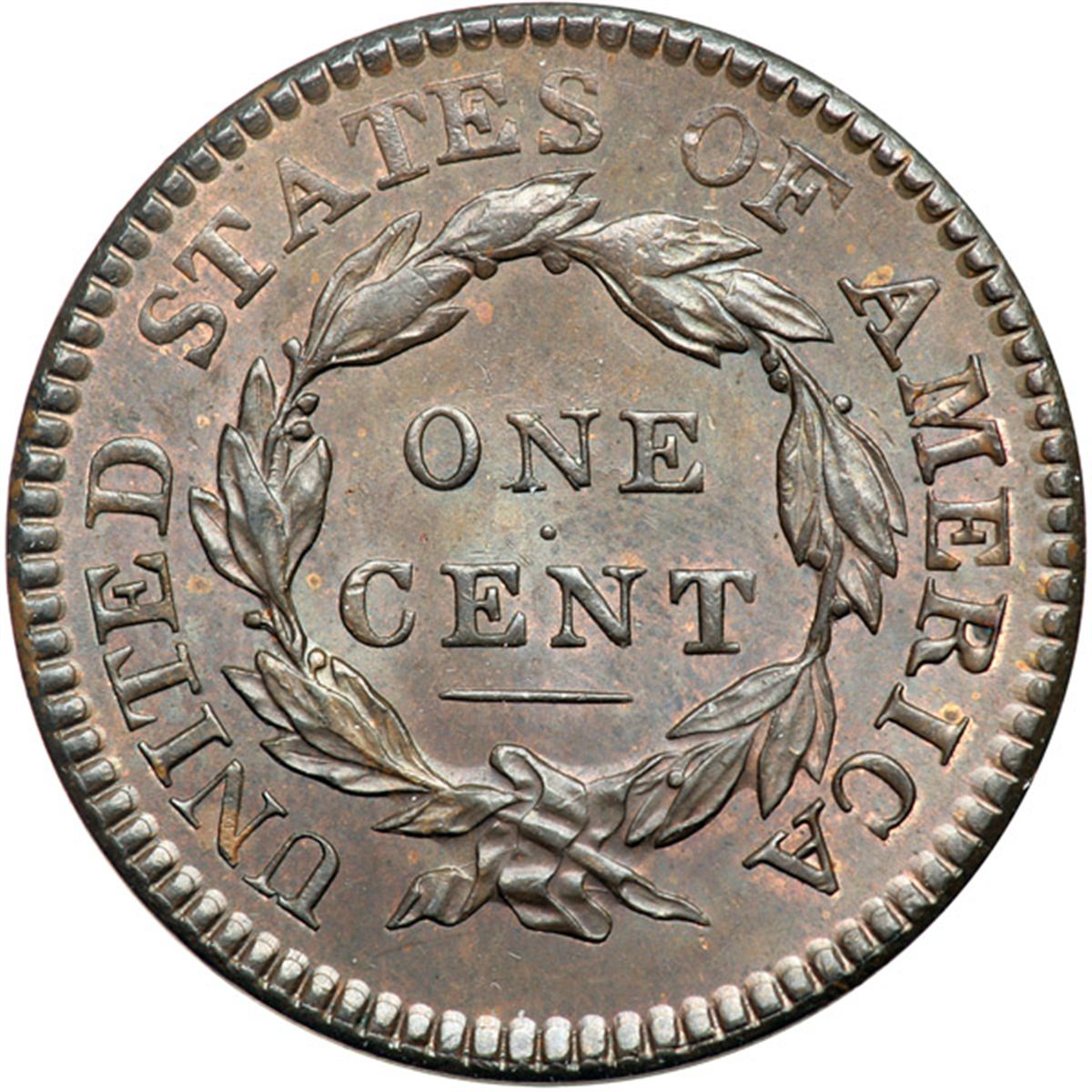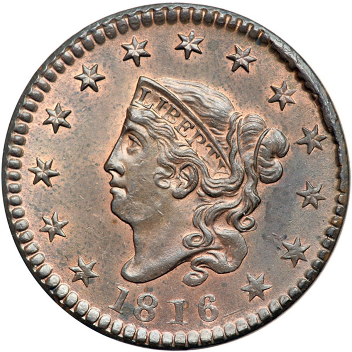 1816 N-2 R1 MS63. Lustrous steel brown and olive with 10% of the original mint red remaining, mostly on the obverse. The surfaces are covered with satiny mint frost and this piece offers excellent eye appeal. The only notable marks are a couple small spots of slightly darker toning at the 8 in the date. E-MDS with the usual rim cud from star 8 to star 11 but without the additional small rim cud at star 12. Most likely from the famous Randall Hoard of mint state cents.