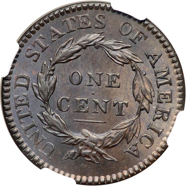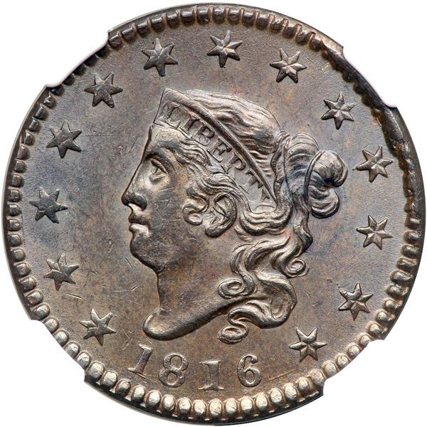 1816 N-2 R1. NGC graded MS-64 Brown. Lustrous bluish steel brown and olive. No spots or stains, just a few very light contact marks scattered over the obverse. The reverse is choice. E-MDS with fine die cracks through the tops of ST and OF but before the rim cud break between stars 11 & 12. Most likely from the famous Randall Hoard of mint state cents of 1816-1820 discovered shortly following the US Civil War. Our grade is MS62.