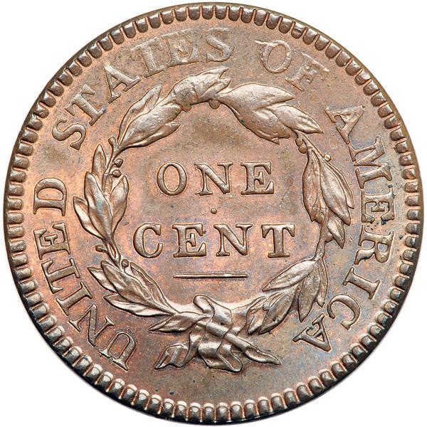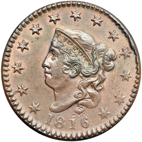 1816 N-2 R1. PCGS graded MS-63 Brown. Glossy light steel brown with hints of bluish steel toning in some protected areas of the reverse and 5-10% of the faded mint red remaining. There are two tiny spots of darker toning in the field under star 5, a trio of tiny ticks over the 16 in the date, and a light nick on the left top of O in OF. E-MDS, without the additional rim cud between stars 11 & 12, but the always presents rim cuds from star 8 to star 11 are clear. The reverse fields are smooth and slightly reflective. The browlock is strong, which is unusual for this variety, but there is some weakness in the leaves at the top of the reverse. The reverse is rotated 5-10 degrees CW from a normal head-to-foot die orientation. An attractive example of this Randall Hoard variety. Our grade is MS62. Pop 2; 1 in 64. A total of 3 graded at PCGS for the variety. DWH #0365 (PCGS # 36526) .