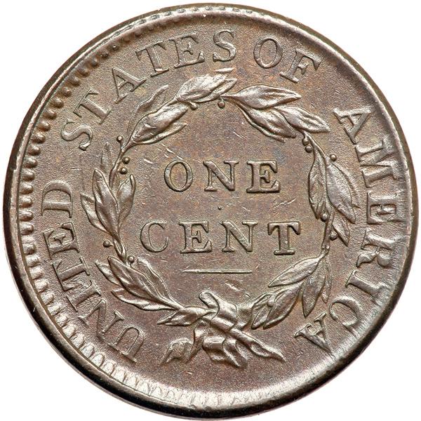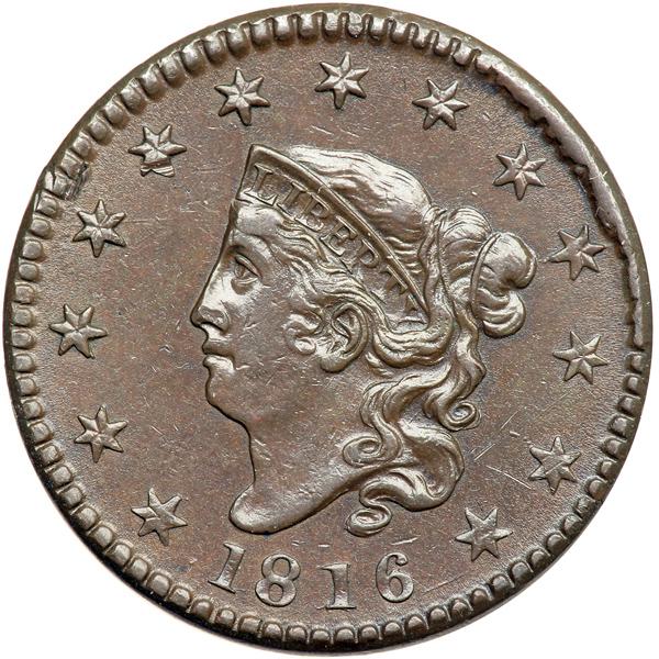 1816 N-3 R4+ . EF-40 Plus. Very attractive glossy chocolate brown with flowline frost covering the protected areas. The only marks are a few nicks at the dentils over star 4 and another dull one on the lower points of star 5. Excellent eye appeal for the grade, very close to EF45. MDS with the always present rim cud from star 8 down to star 11. This relatively brief marriage of two worn dies (obverse of N-1 late mated with the reverse of N-9 late) offers no significant differences in die state. The reverse is slightly misaligned to K-3, which is typical for this variety. A very attractive example of a variety that’s difficult to locate in high grade. Called AU50 net EF40 and tied for CC#8 in the Noyes census, his photo #35867. Bland says EF40 as well but CC#7 among his confirmed examples. DWH #2653.