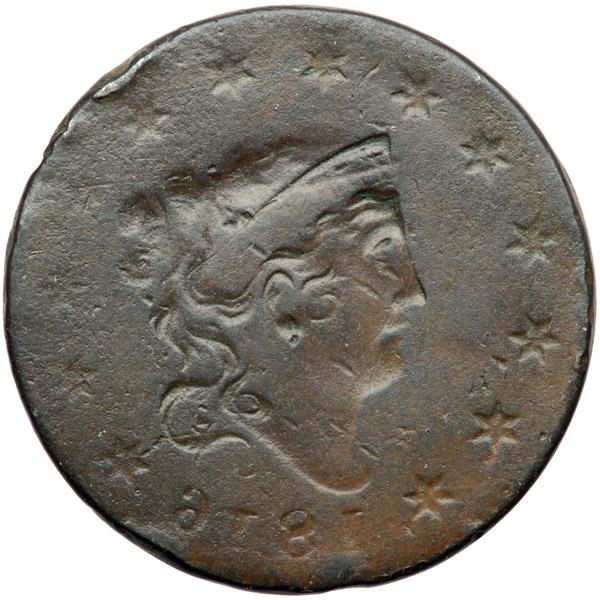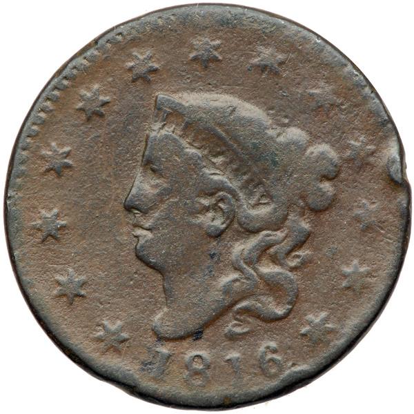 1816 N-4 R2 G4. Obverse Brockage. A couple points sharper but covered with fine granularity. No verdigris but there is a rather strong rim nick at star 10. This cent is a full obverse brockage strike with a small, perhaps 5 degree rotation between the normal obverse and incuse reverse impressions. The incuse date on the brockage side is complete and easily readable. An obverse brockage occurs when a blank planchet is struck between the obverse die and the obverse of a previously struck cent that failed to eject from the press. Cents struck with obvious errors usually come in low grades of preservation. I believe a version of Gresham's Law is in play here. People tended to spend or abuse the "defective" or "bad" money and save the good stuff. And early collectors wanted the best possible specimens so they bypassed the errors in favor of nicely struck pieces. Of course today we have a different perspective.