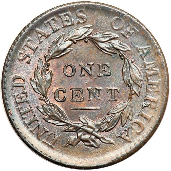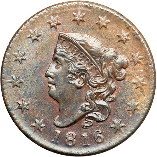 1816 N-4 R2. PCGS graded MS-64 Brown. Beautiful lustrous bluish steel brown with faded mint red in protected areas. No spots, and the only defect keeping this cent from a higher grade is a very faint hairline scratch in the field along the profile of the nose down into the field off the chin. This mark is difficult to see even with a good glass and knowing where to look. M-LDS. The repunching on the bottom of the D in UNITED is nearly gone and the dash between the C & A in AMERICA is dull but visible. The die lines over AME are gone. In the middle of the condition census for the variety. Noyes photo #57109 with no grade listed, but certainly in the condition census. Our grade is MS62. Pop 2; 1 in 66. DWH #2452.