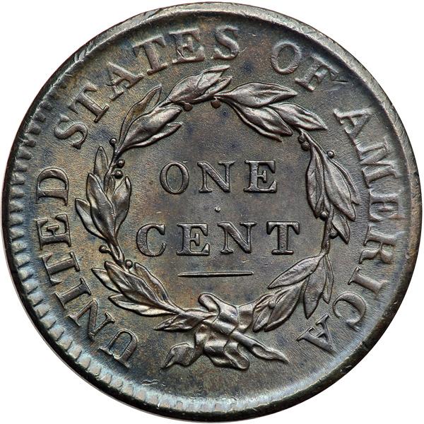 1816 N-5 R3. MS-60. Lustrous dark bluish steel and olive brown, the reverse a few shades lighter than the obverse. The surfaces are satiny and this cent offers excellent eye appeal. The best identifying marks are a barely visible planchet flake under the right foot of the first 1 in the date and a thin nick off the lower left point of star 7. M-LDS. The dentils are weakening as the stars and reverse legend begin to draw to the rim. The repunching under the left foot of the N in CENT is weak but remains visible. Called MS60 net AU55 and tied for CC#9 in the Noyes census, his photo #21334. DWH #3599.