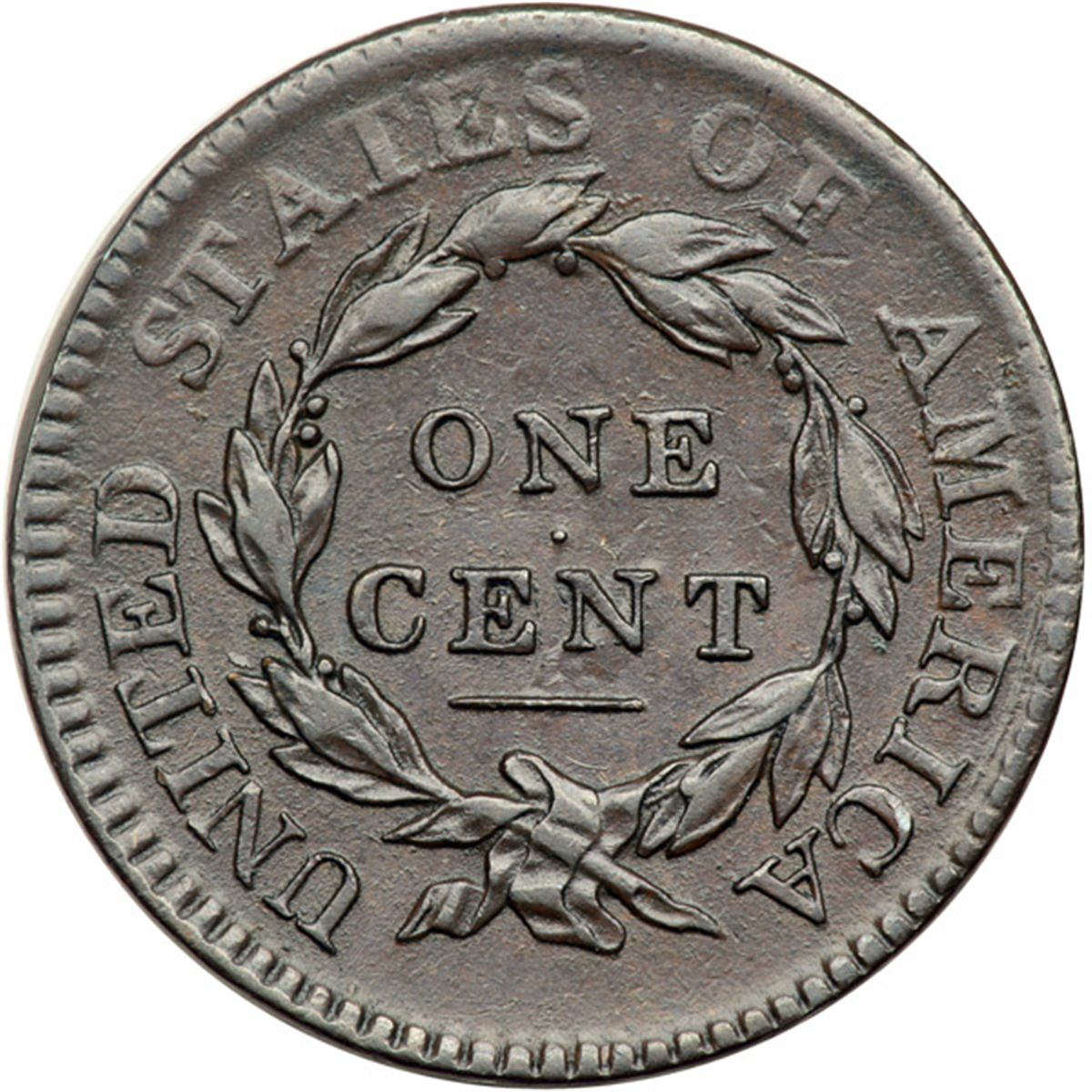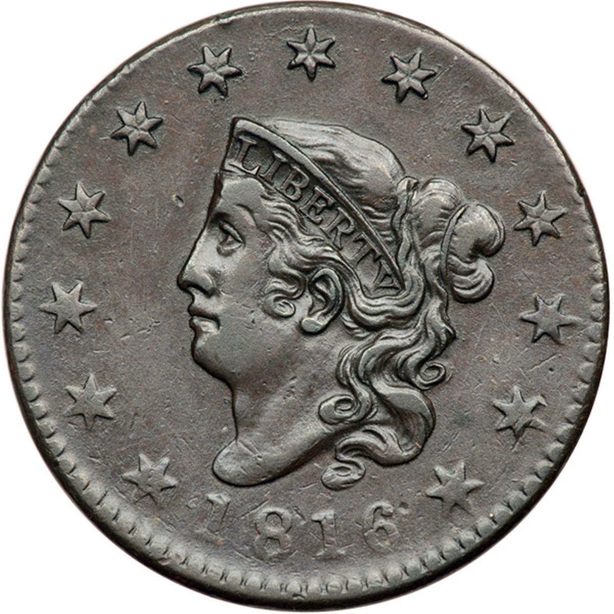 1816 N-7 R3 VF30. Glossy chocolate brown with slightly darker steel brown toning on the highpoints. Smooth and very attractive. The best identifying marks are a tiny pinprick in the field before the forehead, a tiny rim nick above star 6, and a barely visible scrape on the edge outside D-S (which is visible only from the edge of the coin). MDS. Most of the dentils are still visible and there are die clashmarks around the center dot on the reverse. Two dull but clearly visible die lines have been added in the field right of the main and inner curls. An interesting intermediate die state.
