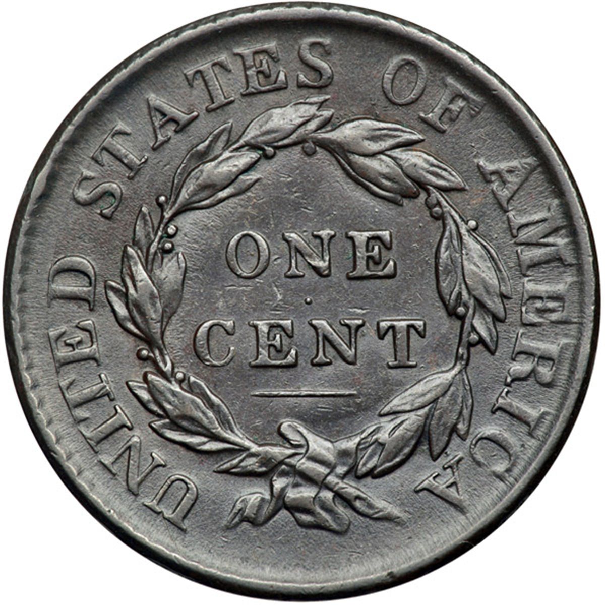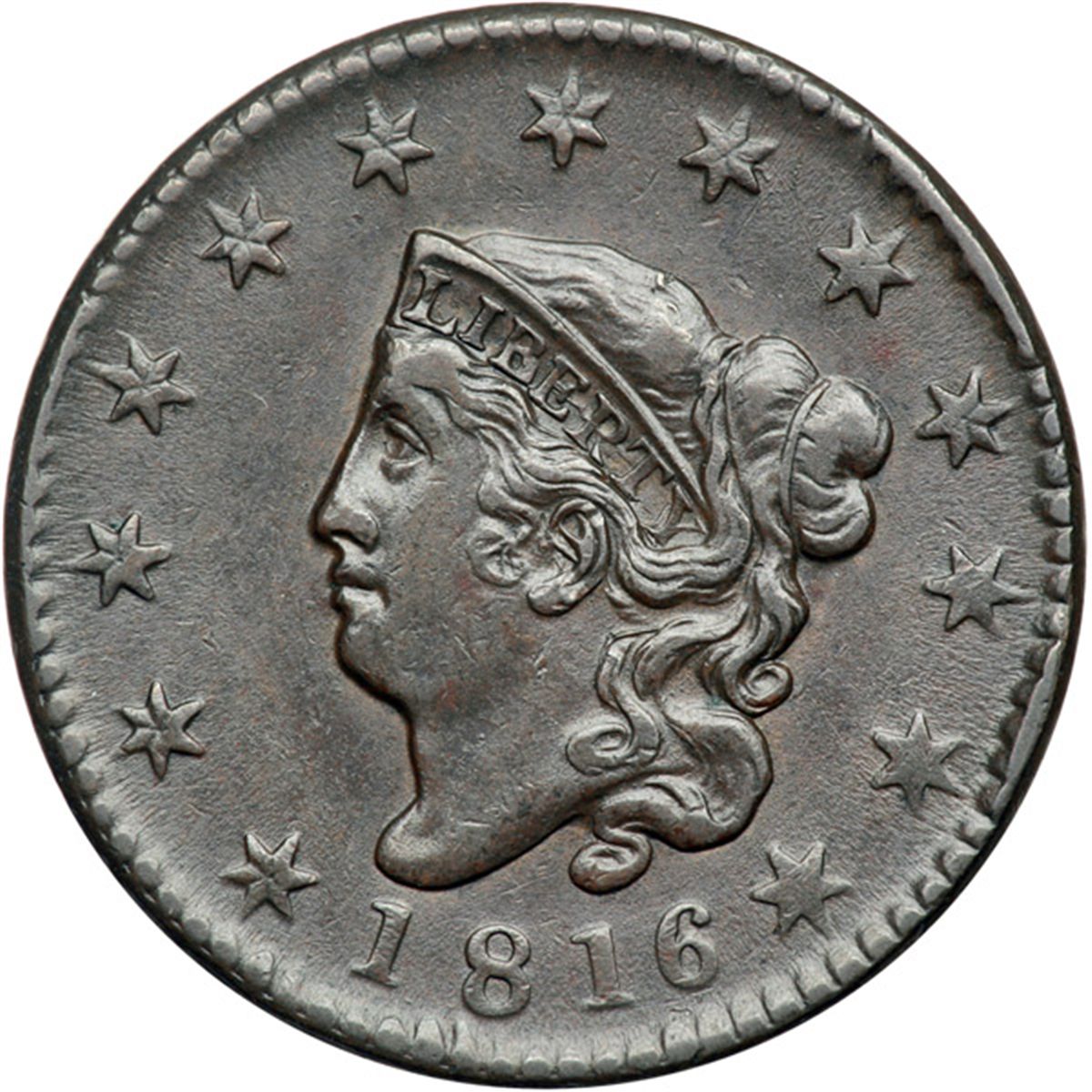 1816 N-8 R3 EF40+. Choice glossy dark steel brown and chocolate with frosty flowline luster covering the fields and protected areas on both sides. Very nice for the grade, just a few tiny ticks from flawless. The best identifying mark is a small, dull rim nick at the first S in STATES. Close to EF45. LDS with thin but clear rim cud breaks at stars 9-10 and 11-12 plus a weaker rim cud at stars 3-4. The reverse is rotated 30 degrees CCW. Called EF45 and CC#12 in the Noyes census, his photo #59554. Removed from an NGC slab graded AU55 (NGC label included, #308040-002, and it shows the attribution and Reiver provenance).