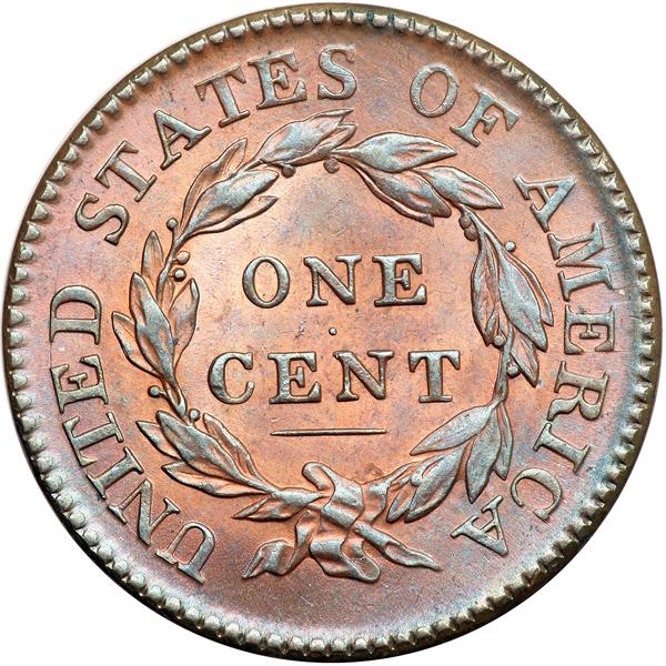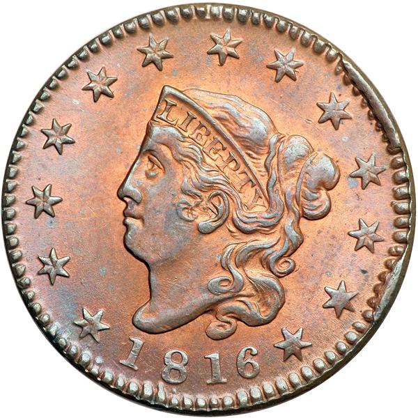 1816 N-8 R3. PCGS graded MS-64 Red & Brown. Beautiful frosty mint red fading to lustrous bluish steel brown, at least a third of the mellowed original color remaining. The surfaces are satiny and virtually flawless. A couple very light contact marks left of the bottom of star 9 and a speck of darker toning near the dentils midway between stars 11 & 12 are the best identifying marks. MDS with strong rim cud breaks at stars 8.5-10 and 11-12. The terminal rim cud at stars 3-4 has not formed as those dentils are clearly visible on this example. The repunching over the left top of the 8 is weak but still visible. A bit softly struck on the right sides while the left sides are fully impressed. Otherwise this piece is a gem. A beautiful cent, finest known of this scarce die variety. Not seen by Bland or Noyes. Removed from an NGC slab graded MS65RB (NGC label included). Our grade is MS64. Pop 1; The only Red Brown graded at PCGS for the variety. DWH #3246.