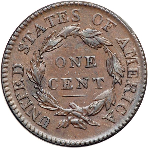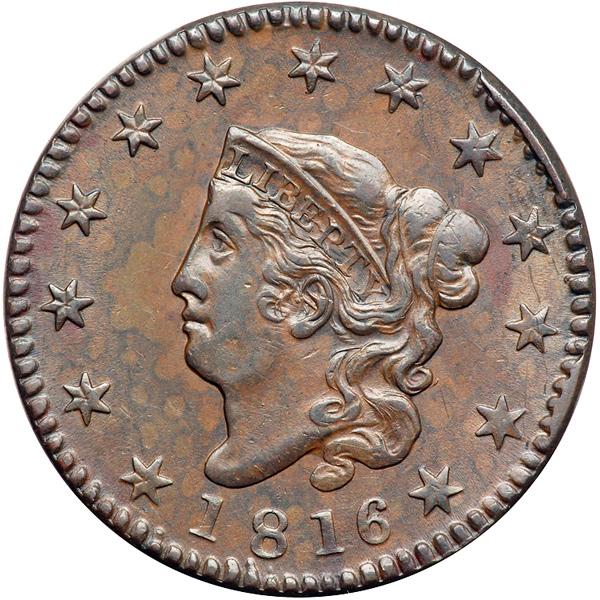 1816 N-8 R3. VF-35. Slightly sharper but there are a few tiny scratches at stars 10-12 and a small patch of microscopic roughness over NE in ONE. These defects are barely visible and the eye appeal of this cent is excellent. Frosty light chocolate brown mottled with darker olive brown and chocolate on the obverse. Fine flowline luster covers the protected areas on both sides. M-LDS showing two clear rim cud breaks on the right side of the obverse, but the rim cud on the left side of the obverse has not formed.