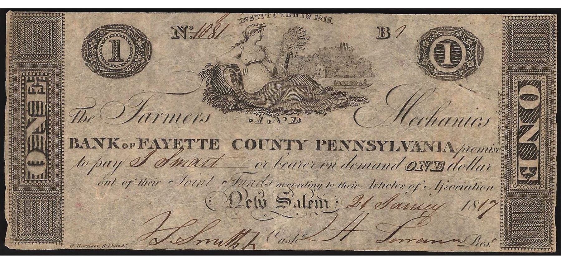 1817 $1 The Farmers Mechanics Bank of Fayette County Pennsylvania Obsolete Note