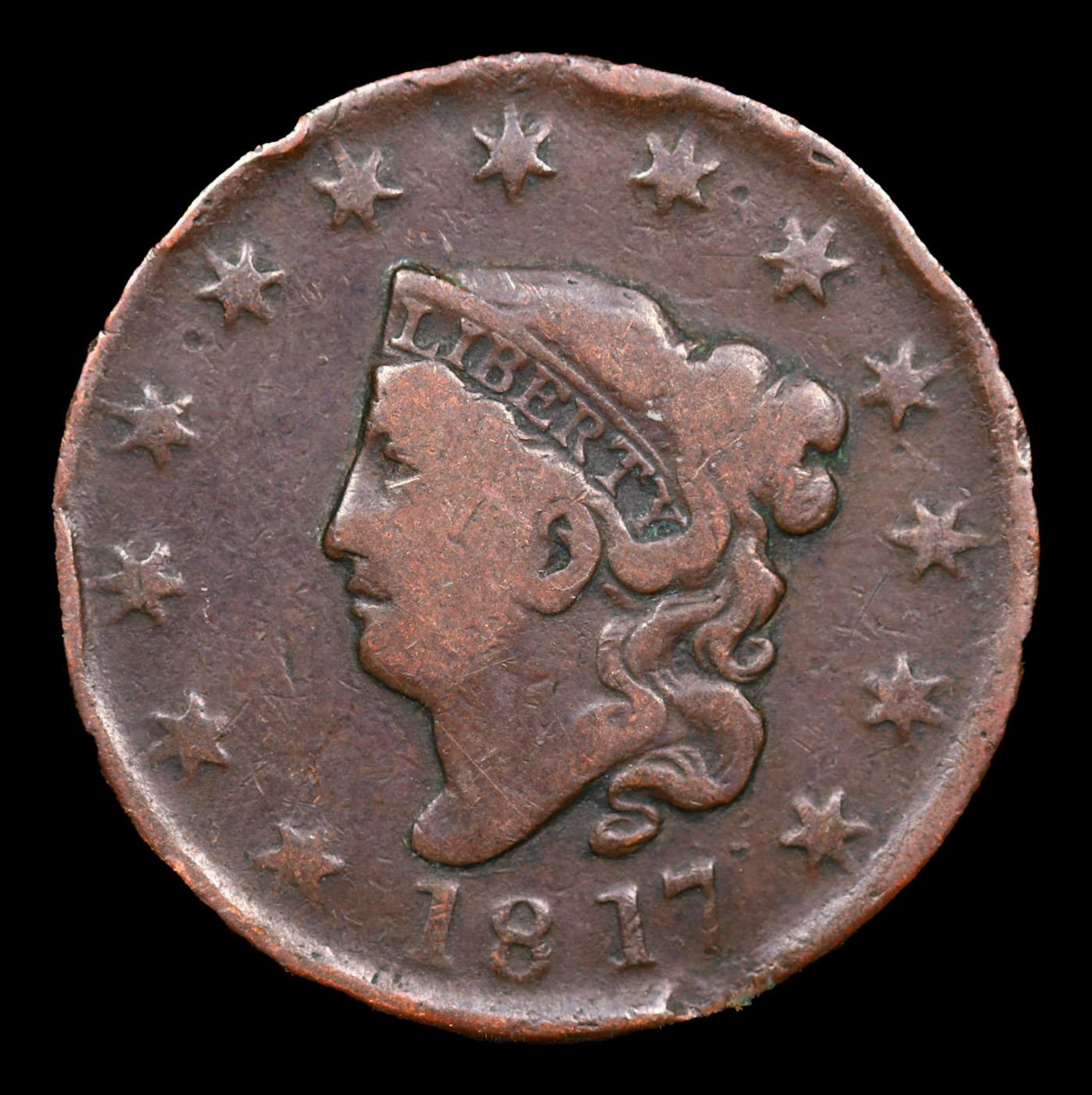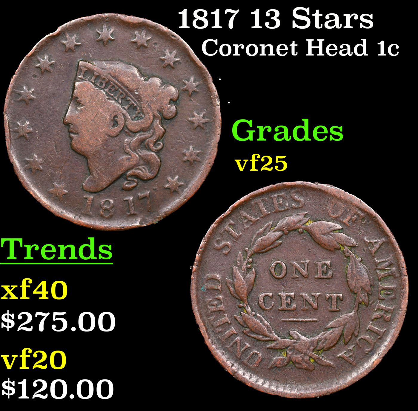1817 13 Stars Coronet Head Large Cent 1c Grades vf+.
