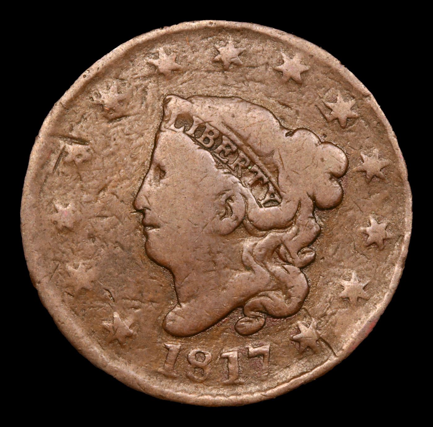 1817 13 stars Coronet Head Large Cent 1c Grades f, fine.