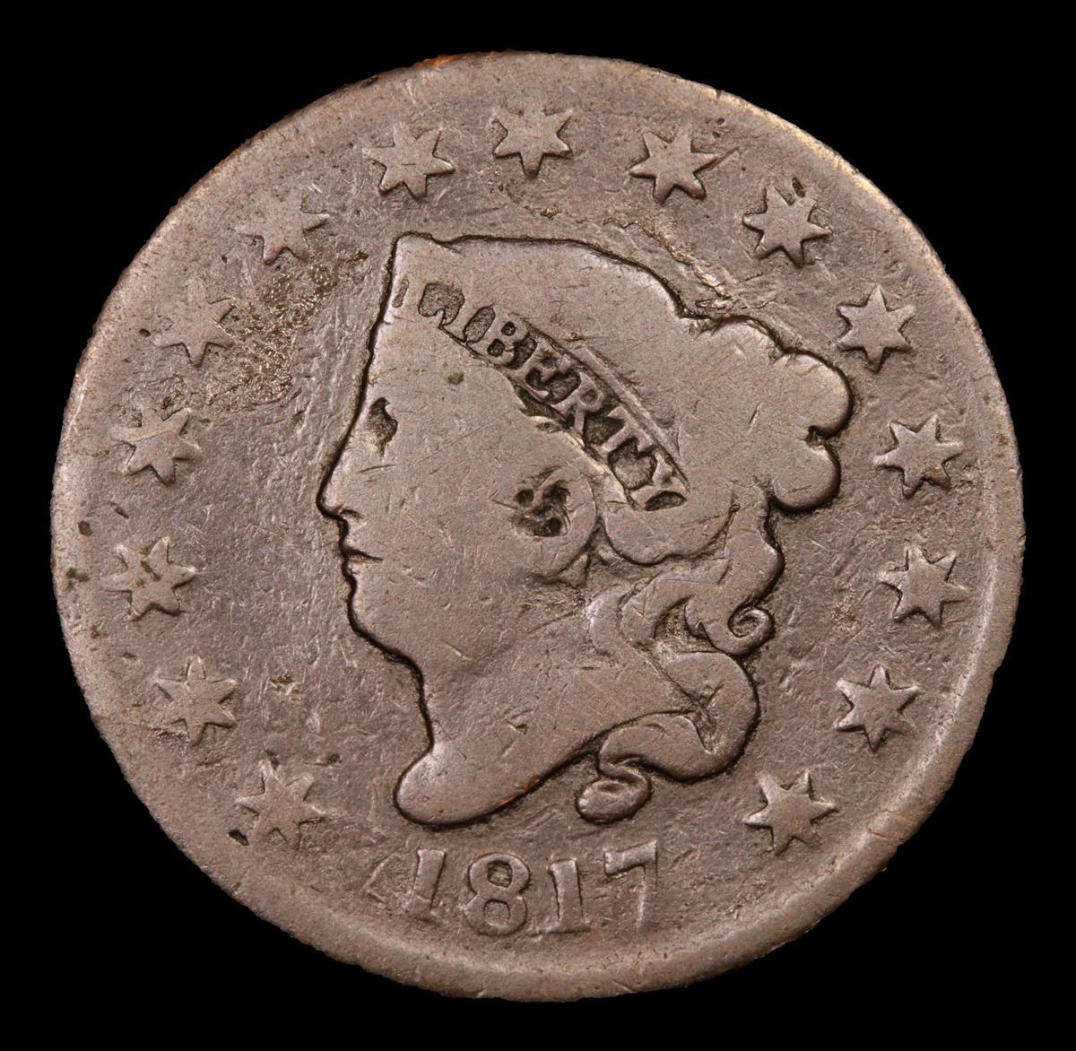 1817 15 Stars Coronet Head Large Cent 1c Grades f+. This unusual variety shows 15 stars on the obverse instead of the usual 13. This was strictly an engraving error that occurred when the stars were placed too closely together. It is in no way related to the earliest U.S. coins that had varying number of stars. In those cases, the number of stars started at 13, then increased with the addition of each new state, but the number eventually reverted back to 13 as the designs became too crowded. By 1817, there were 18 states in the Union, thus there is no valid connection with the number 15.