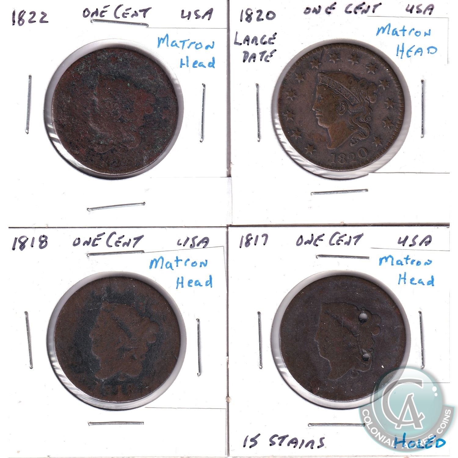 1817, 1818, 1820 Large Date & 1822 USA Matron Head Pennies. 4pcs