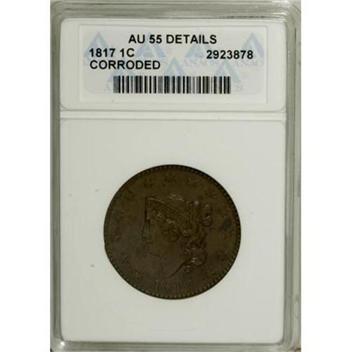 <B>1817 1C 13 Stars--Corroded--ANACS. AU55 Details.</B></I> NGC Census: (13/177). PCGS Population (19/111). Mintage: 3,948,400. Numismedia Wsl. Price for NGC/PCGS coin in AU55: $260. (#1594)<BR><BR><B>Coin Engraver:</B> Robert Scot or John Reich<BR><BR><b>Shipping:</b> Coins & Currency (<a target="_blank" href="http://www.heritageauctions.com/common/shipping.php">view shipping information</a>\)