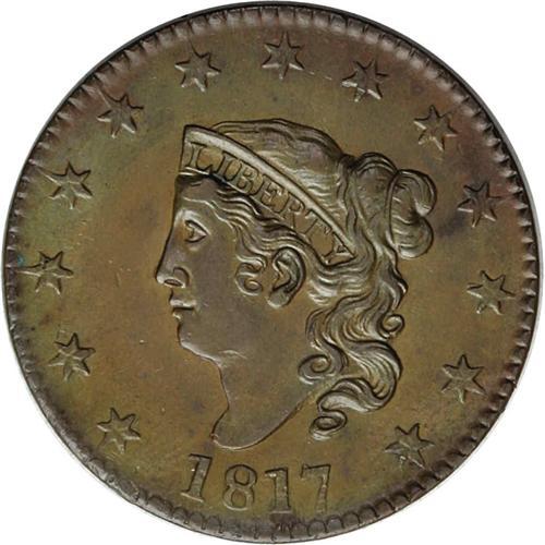 <B>1817<1C> 13 Stars. N-13, R.1--Improperly Cleaned--NCS. AU Details. XF45 EAC.</B></I> Light olive brown from an old cleaning. Glossy, smooth surfaces. Some minor marks. Middle Die State.<BR><I>Ex: Ron Cooper (11/25/1969).</B></I> Envelope Included.