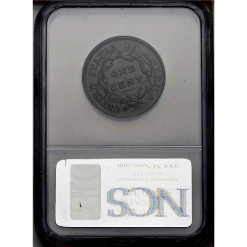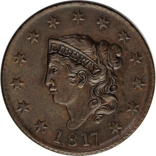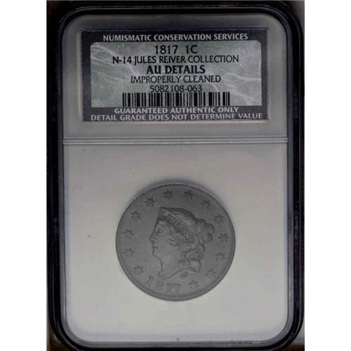 <B>1817<1C> 13 Stars. N-14, R.1--Improperly Cleaned--NCS. AU Details. AU50 EAC.</B></I> Chocolate with some faded mint red on the obverse. The reverse is also chocolate with evidence of an old cleaning. Smooth, glossy surfaces. There is a small spot at the upper right of the O in OF. Some minor marks. Probably from the famous Randall Hoard.<BR><I>Ex: Radford Stearns (Mayflower, 12/1966), lot 407.</B></I> Envelope Included.