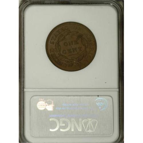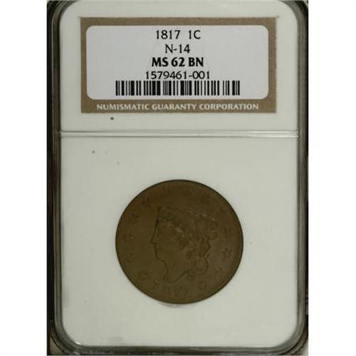 <B>1817 1C 13 Stars MS62 Brown NGC.</B></I> N-14, R.1. This deep chocolate-brown Randall Hoard cent has impressively smooth fields and devices, and much of the design is sharply struck. A spot is inconspicuously relegated to the wreath near the E in ONE. EAC 55.<BR><BR><B>Coin Engraver:</B> Robert Scot or John Reich<BR><BR><b>Shipping:</b> Coins & Currency (<a target="_blank" href="http://www.heritageauctions.com/common/shipping.php">view shipping information</a>)