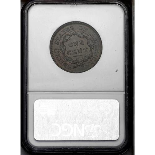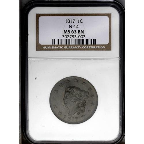 <B>1817<1C> 13 Stars MS63 Brown NGC.</B></I> N-14, R.1. A satiny chocolate-brown example that reveals glimpses of faded mint red across portions of the reverse. A couple of minor imperfections near the chin and a thin mark beneath the first A in AMERICA decide the grade. EAC 60. <BR><BR><B>Important notice:</B> Heritage usually auctions material at the rate of 200-250 lots per hour. On some occasions eBay Live bid software or the Internet may not be able to keep up with the pace of the auction. We recommend placing a realistic absentee bid now as insurance to avoid disappointment. Occasionally the auctioneer may eliminate or reject an eBay Live bid, and the auctioneer may also reopen a lot after the close of the eBay live bidding (usually because we missed an audience bid), and may reject your bid even if it shows you as the winning bidder. By bidding via eBay Live, you agree that Heritage may award the lot to another bidder at its sole discretion under the circumstances described above or any other reasonable circumstances. Since eBay bids are not shown to us until we open the lot on the floor, we treat those bids just like floor bids. In most cases the floor responds before the eBay bid is presented to us, due to Internet lag time, so for consistency we have made it a policy that floor bids are always considered first over tie eBay live bids. Also please note that all Heritage lots purchased through eBay Live carry a 20% Buyer's Premium. Please make sure you read the Terms and Conditions before you bid. This lot is being auctioned in conjunction with a live floor auction by Heritage Galleries & Auctioneers. All final auction and invoice information will be supplied by Heritage Galleries & Auctioneers, and all other information should be considered preliminary. Lot:262 <BR><BR><B>Winning Notification and Billing:</B> After the FINAL session in this auction is complete, Heritage will send e-mail and snail mail invoices. This process normally takes several days. All final auction and invoice information will be supplied by Heritage Galleries & Auctioneers, and all other information should be considered preliminary. <BR><BR>This auction will be conducted on a live auction floor and over the Internet through eBay Live. If you choose to place an absentee bid, please take a moment to <font color='#0000ff'><u><a href='http://pages.ebay.com/liveauctions/help/before/laabsentee.html'>learn how eBay Live absentee bidding works</a></u></font><font color='#000000'>