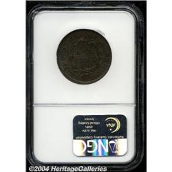 <B>1817<1C> 13 Stars MS63 Brown NGC.</B></I> N-9, R.2. Die State A. A satiny representative with two-tone tan and mahogany patina. The stars have bold centrils. The obverse rim at 5 o'clock has a small retained lamination, as made. NGC N-9 Population: 3 in 63, none finer (4/04). <BR><BR><B>Important notice:</B> Heritage usually auctions material at the rate of 200-250 lots per hour. On some occasions eBay Live bid software or the Internet may not be able to keep up with the pace of the auction. We recommend placing a realistic absentee bid now as insurance to avoid disappointment. Occasionally the auctioneer may eliminate or reject an eBay Live bid, and the auctioneer may also reopen a lot after the close of the eBay live bidding (usually because we missed an audience bid), and may reject your bid even if it shows you as the winning bidder. By bidding via eBay Live, you agree that Heritage may award the lot to another bidder at its sole discretion under the circumstances described above or any other reasonable circumstances. Since eBay bids are not shown to us until we open the lot on the floor, we treat those bids just like floor bids. In most cases the floor responds before the eBay bid is presented to us, due to Internet lag time, so for consistency we have made it a policy that floor bids are always considered first over tie eBay live bids. Also please note that all Heritage lots purchased through eBay Live carry a 20% Buyer's Premium. Please make sure you read the Terms and Conditions before you bid.